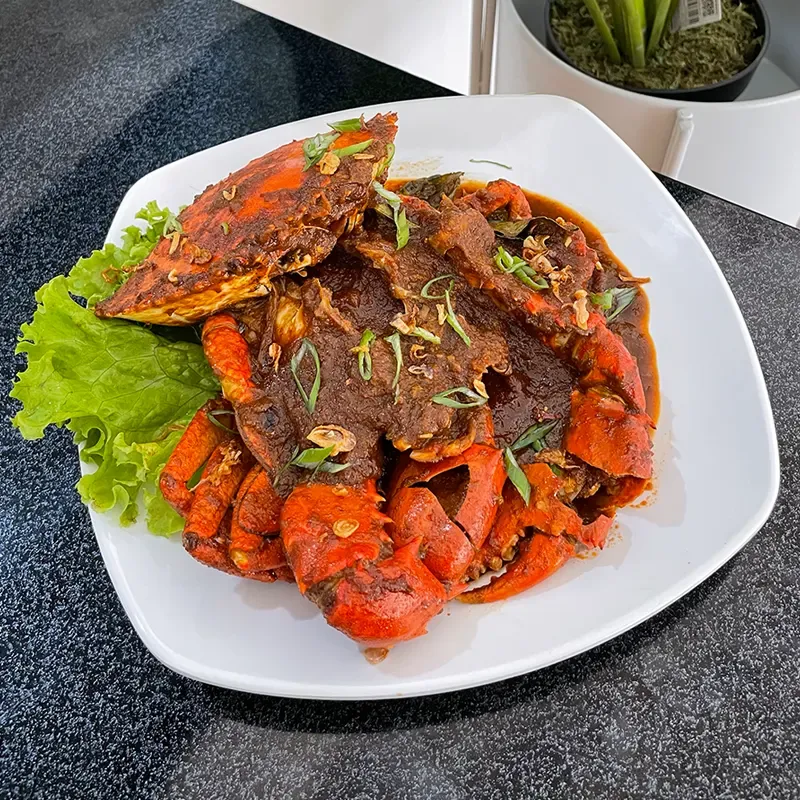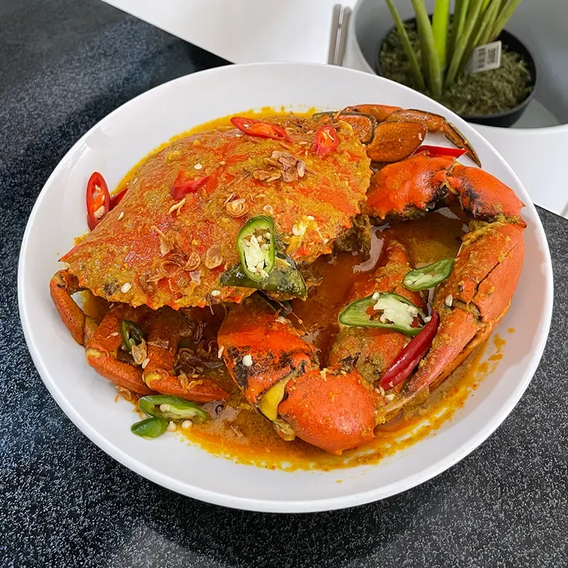 Kepiting yang dimasak dengan kuah kari yang kaya santan dan rempah.