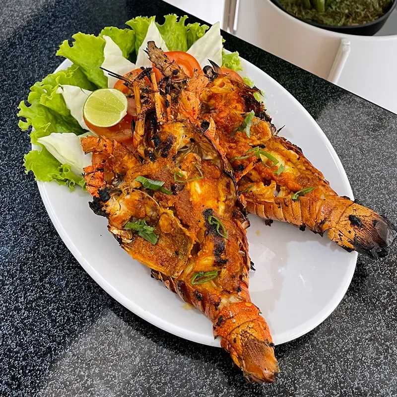 Lobster segar yang dibakar sempurna dengan bumbu lengkap yang meresap hingga ke dagingnya.
