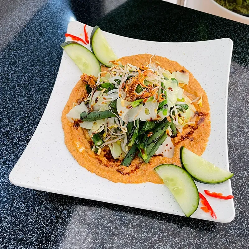 Aneka sayuran rebus yang disiram dengan bumbu kacang yang kental dan bercita rasa manis, gurih, dan sedikit pedas.