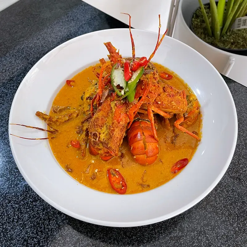 Nikmati kelezatan lobster yang dimasak dengan bumbu rendang khas Minangkabau.