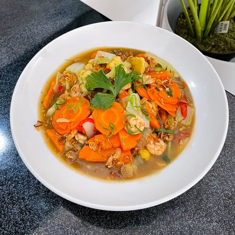 Tumisan aneka seafood seperti udang, cumi, dan kerang, dengan berbagai macam sayuran.