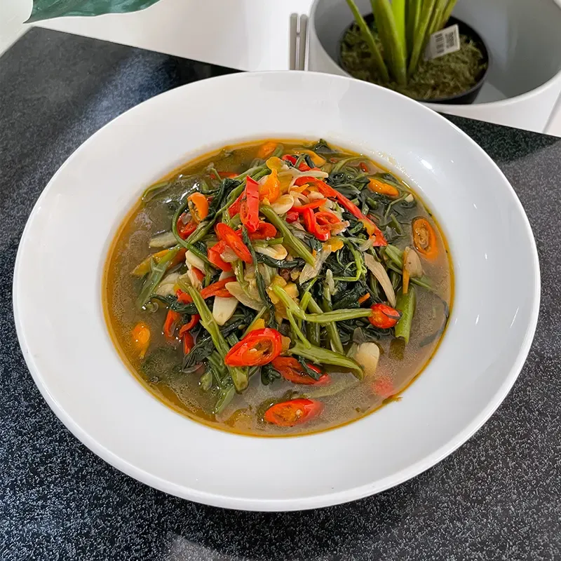 Sayuran kangkung yang ditumis dengan bumbu bawang merah, bawang putih, dan cabai.